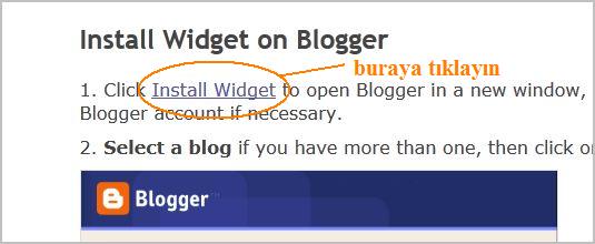 2.ADIM GET WİDGET Butonunu tıkladığımızda yeni bir sayfa açılacak ve bu sayfada şekilde de gördüğünüz İNSTALL WİDGET yazan yeri tıklıyoruz.