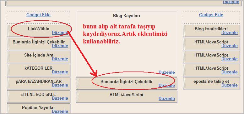 4.ADIM:Link Within yazan Gadget işekilde gördüğümüz yere sürükleyip bırakıyoruz ardından kaydediyoruz.Artık “Bunlarda ilginizi çekebilir” eklentisi bloğunuza eklendi hayırlı olsun:).